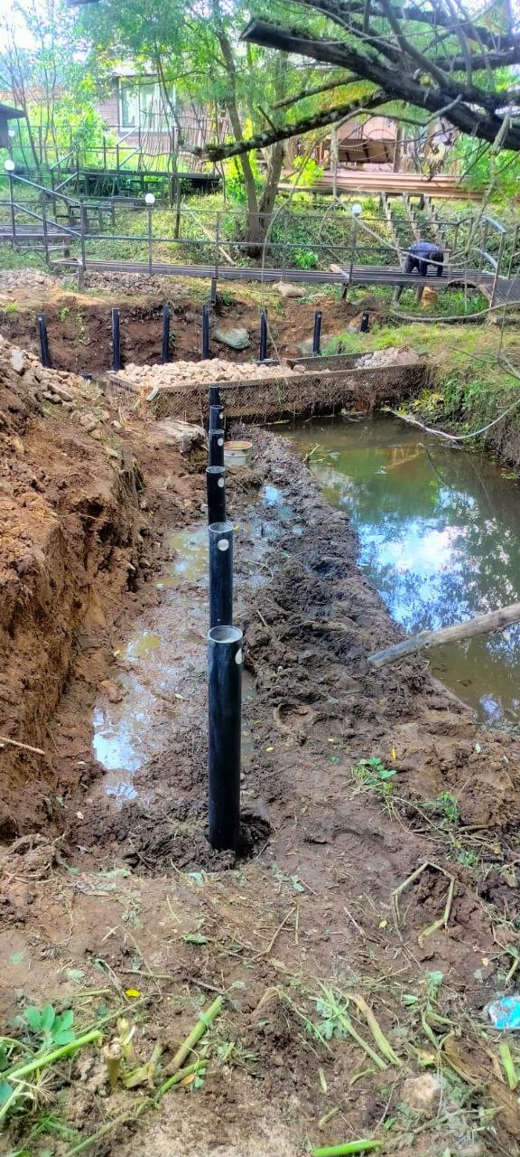 Наша команда предложила решение — установку винтовых свай для стабилизации береговой линии. В ходе проекта были использованы винтовые сваи диаметром 108 мм и длиной 3 метра. Эти сваи были равномерно распределены и аккуратно вкручены в почву с использованием профессионального оборудования. Благодаря правильному монтажу свай, заказчик получил прочную основу для дальнейшей установки металлических конструкций, которые будут удерживать берег от дальнейших разрушений.